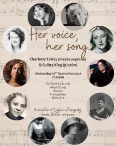 Charlotte is a keen lieder singer and recitalist and has worked closely with pianists such as James Baillieu, Malcolm Martineau and Christopher Glynn. As a recitalist she has performed as part of the ‘Leeds Lieder’ festival, Dorchester and Holt Festivals and sung Elgar’s Sea Pictures with Oxford Studio Orchestra. Charlotte works extensively with the Orchestra of St. John’s conducted by John Lubbock. She has sung the St. John Passion, St. Matthew Passion, Resighi’s Il Tramonto, Handel’s Messiah and the role of the Sorceress in Purcell’s Dido and Aeneas in St. John’s Smith’s Square and Dorchester Abbey.